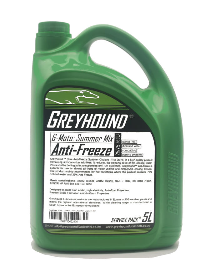 Greyhound™ Blue Anti-Freeze Summer Coolant (RTU 25/75) is a high-quality product containing anti-corrosion additives. It reduces the freezing point of the cooling water and increases the boiling point. The anti-corrosion additives give protection to aluminium, copper, cast iron and other metals used in cooling systems. The product is diluted using deionized water. The product is suitable for a very light minus temperature and is mainly designed to protect your car’s cooling system in warmer climates. Greyhound™ anti-freeze is suitable for use in almost all types of motor vehicle and motorcycle cooling circuits.