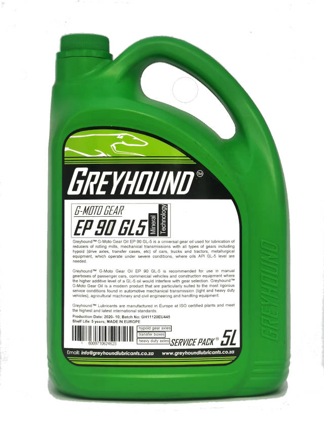 SAE 90 GL5 gear oil from Greyhound Lubricants G-Moto is a high-performance extreme pressure lubricant designed for hypoid gears, drive axles and heavily loaded drivetrain systems. It provides strong load-carrying capability and protection under severe operating conditions.