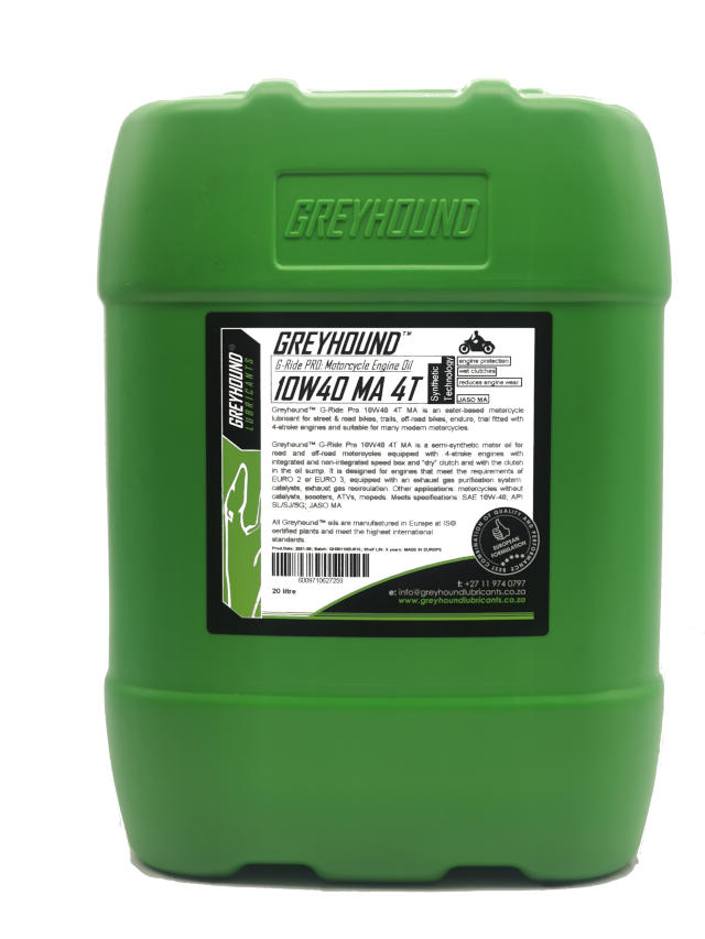 Greyhound™ G-Ride Pro 10W40 4T MA is an ester-based motorcycle lubricant for street & road bikes, trails, off-road bikes, enduro, trial fitted with 4-stroke engines and suitable for many modern motorcycles. Greyhound™ G-Ride Pro 10W40 4T MA is a semi-synthetic motor oil for road and off-road motorcycles equipped with 4-stroke engines with integrated and non-integrated speed box and “dry” clutch and with the clutch in the oil sump. It is designed for engines that meet the requirements of EURO 2 or EURO 3, equipped with an exhaust gas purification system: catalysts, exhaust gas recirculation. Other applications: motorcycles without catalysts, scooters, ATVs, mopeds. Greyhound™ G-Ride Pro 10W40 4T MA can be used where SAE 10W-40 engine oil is recommended by the manufacturer. It is ideal for use in workshops and motorcycle service centres as a high-quality semi-synthetic grade engine oil, suitable for many different manufacturers.
