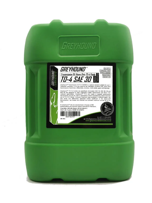 Greyhound Lubricants Transmission Oil TO-4 SAE 30 is a premium drive-train and hydraulic fluid developed for Caterpillar, Komatsu and other off-highway machinery operating under the TO-4 performance specification.